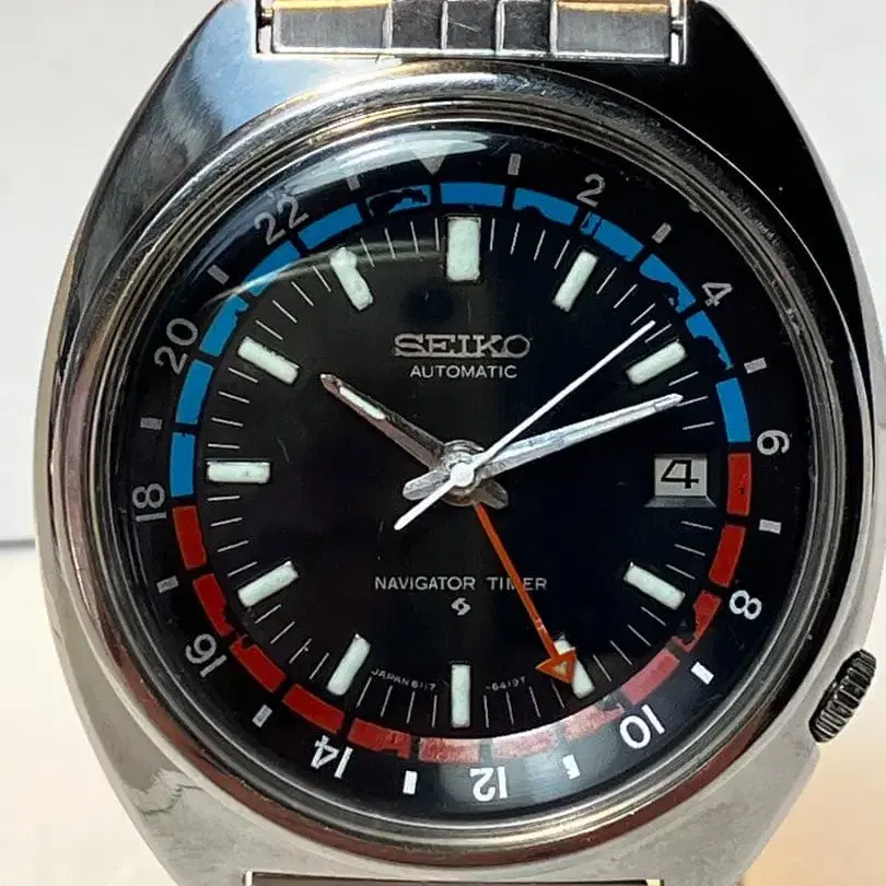 [ 6117-6410 ] SEIKO NAVIGATOR TIMER 세이코 내비게이터 타이머 6117-6410 정밀 조정 완료 가격: 75000엔 → 설날 특가: 65000엔 [상품 설명] 정밀 조정 완료, 초특가 6117-6410이라고 듣고 월드 타임 3rd 모델을 떠올리셨다면 상당한 시계 애호가이십니다. 이 내비게이터 타이머는 월드 타임 3rd 모델과 동시에 출시된 형제 모델입니다. 기능은 완전히 동일하며 무브먼트도 공유합니다. 따라서 다이얼과 이너 베젤을 월드 타임으로 바꾸면 구별할 수 없습니다. 월드 타임처럼 화려한 화면을 선호하지 않는 분들에게는 실용적이고 인기가 많았습니다. 다만 당시에는 화려한 디자인이 선호되던 시대였기 때문에 월드 타임 모델이 더 많이 팔린 것으로 보입니다. 내비게이터 타이머는 판매량이 적어 깨끗한 제품은 희귀합니다. 6117-6410. 작동 확인 및 조정 완료. 다이얼 표기는 위에 SEIKO, 아래에 NAVIGATOR TIMER입니다. 다이얼 외곽 테두리의 1분 간격 인덱스도 깨끗합니다. 이너 베젤의 파란색과 옅은 노란색 회전식 인덱스는 해외여행 등에서 빨간색 화살표 모양의 24시간 바늘과 함께 낮과 밤을 구분하는 데 사용합니다. 24시간 바늘은 당시 처음으로 세계로 나아가는 최전선의 비즈니스맨의 스탯이었다고 생각합니다. 그런 비즈니스맨에게는 월드 타임보다 깔끔하여 비즈니스에 적합하고 인기가 많았을 것입니다. 24시간 바늘과 컬러풀한 이너 베젤이 인상적인 디자인입니다. 지금도 주목도가 높으며, 70년대 특유의 에너지를 느낄 수 있어 많은 컬렉터들에게 사랑받고 있습니다. 벨트 역시 SEIKO의 디자인성이 뛰어난 스테인리스 벨트입니다. [확인 및 조정 완료 항목] 24시간 바늘 작동. 문제 없음. 12시간 바늘과 24시간 바늘 연동 오차. 문제 없음. 이너 베젤 회전. 문제 없음. 날짜 변경 기능. 문제 없음. 시간 정밀도 (타임그래퍼 일차 ±1분 이내) (24시간 평평하게 놓은 상태로 실측해도 ±1분 이내였습니다.) (참조 값이며 보증은 아닙니다.) 무브먼트는 녹 없이 좋은 상태입니다. 케이스는 방청 처리 완료되었습니다. 뒷면 커버의 O링 등도 교체 장착 완료되었습니다. 이 정도 레벨이면 8만 엔을 넘어서 폭등하고 있습니다. 미확인 항목은 현재 상태 그대로입니다. 벨트 길이는 출하 시 요청에 따라 조정해 드립니다. 설날 연휴로 인해 발송은 7일 이후에 가능합니다.