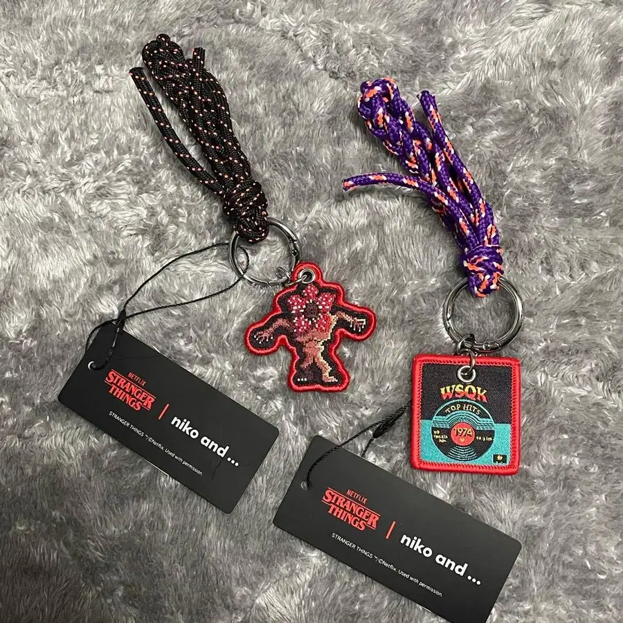 Stranger Things 디자인의 키링, 패치 스타일로 오렌지와 보라색의 컬러풀한 태슬 포함.