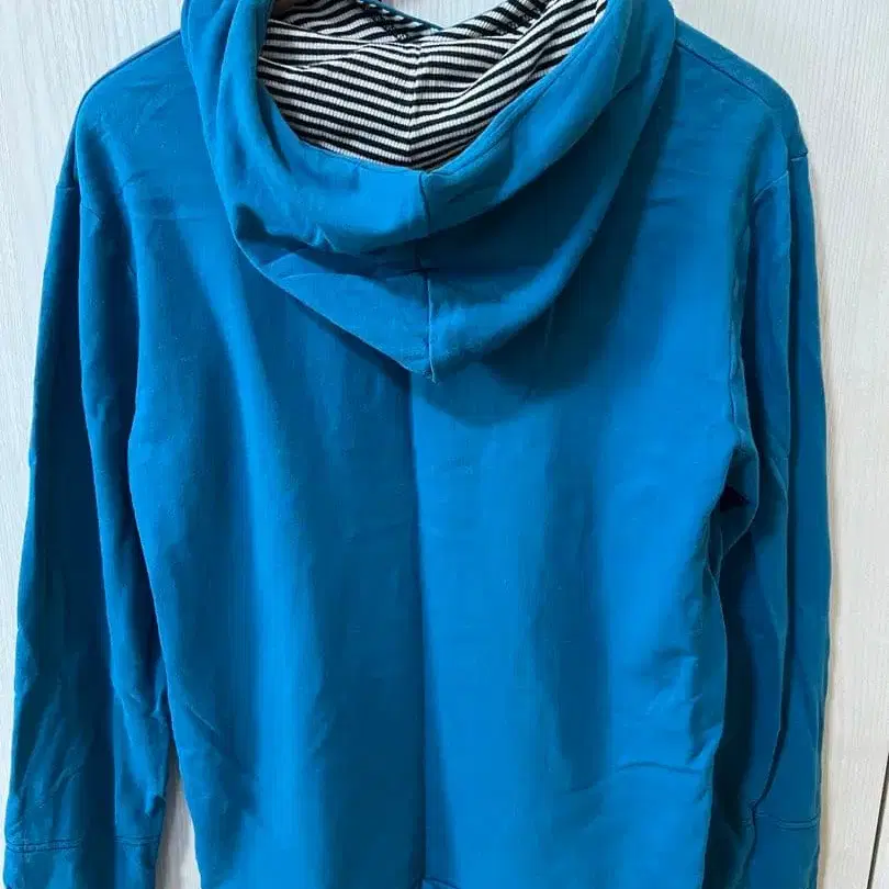 스트라이프 후드 내부와 별 자수가 특징인 블루 후드티.