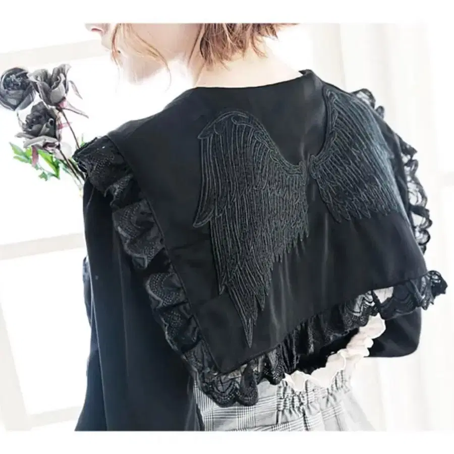 지뢰계 세일러 블라우스 (리본 포함) 입니다. 뒷면 옷깃 부분에 깃털 자수가 있습니다. 겉옷에서 세일러 카라를 내면 천사의 깃털이 보여서 정말 귀여운 디자인이라고 생각합니다. 얼룩 등은 없지만, 구매 후 바로 가장 아래 버튼이 떨어져서 여분의 버튼도 없습니다. 셔츠 안에 넣으면 보이지 않기 때문에 그대로 두었습니다. 총장 54cm, 어깨 너비 33cm 지뢰계 블라우스 블랙 세일러 카라 깃털