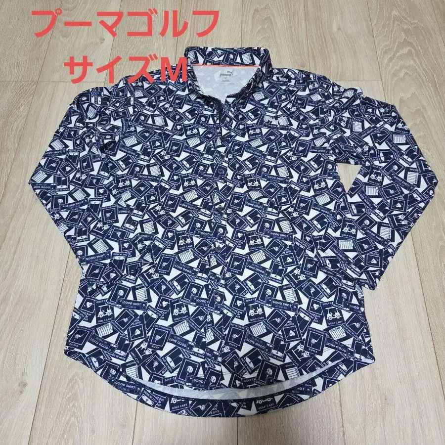 골프 관련 그래픽이 특징인 PUMA의 긴팔 셔츠, 폴리에스테르 100% 소재로 쾌적한 착용감.