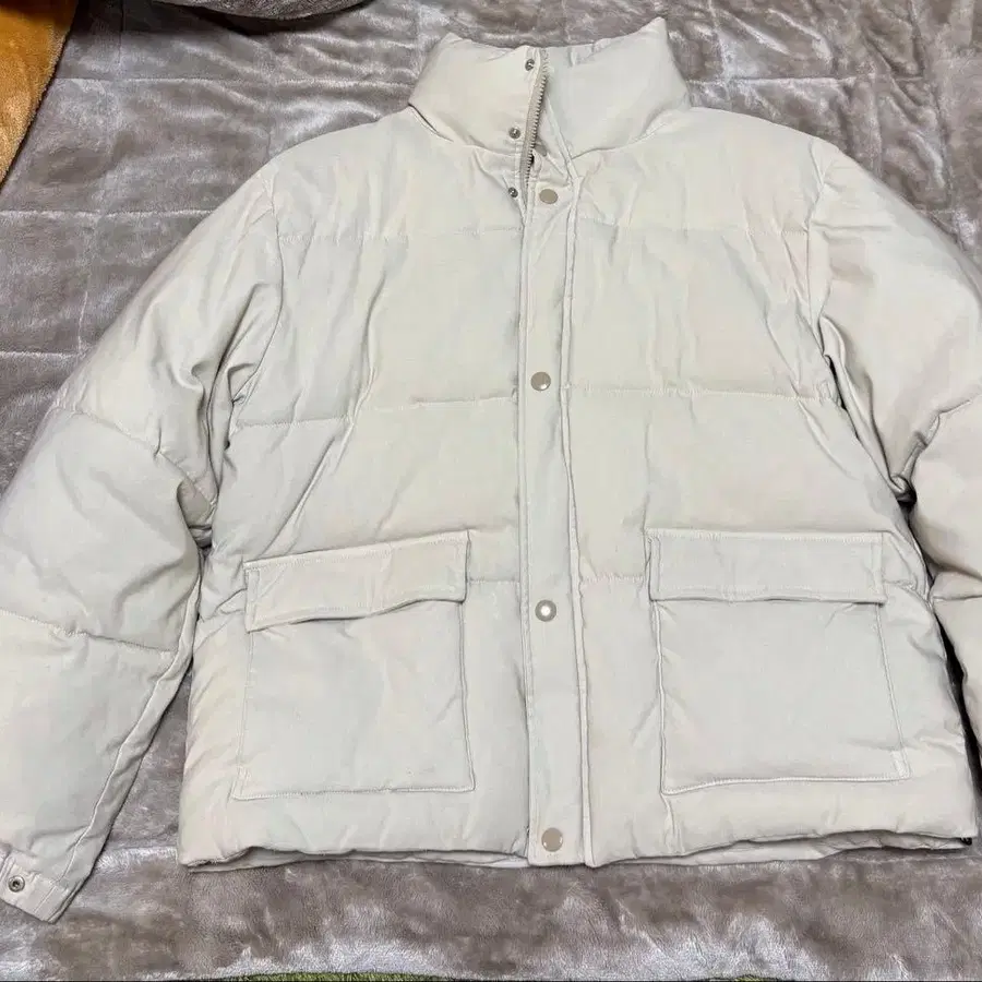 크림색 와이드 캐주얼 다운 자켓, 밑단에 드로우 스트링이 있어 조정 가능.
