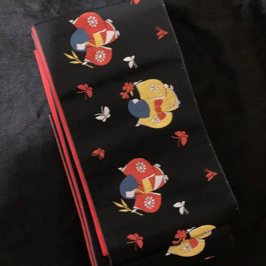 작가 히다 케이코가 그린 블랙 베이스에 빨간색과 옐로우 컬러의 기모노를 입은 귀여운 아이들 패턴의 사랑스럽고 아름다운 반폭 오비. 뒷면은 빨간색에 린넨 잎 패턴. 1개로 2개 분량을 즐길 수 있습니다.