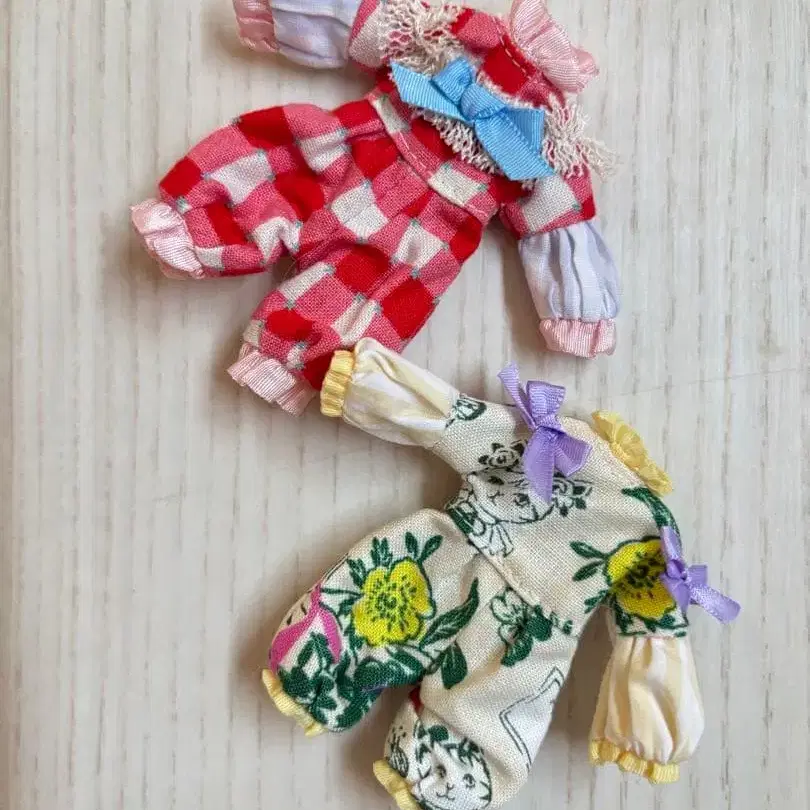 2〜3회 사용했습니다. 빨간색과 화이트의 체크 무늬와 꽃무늬가 귀여운 옷 갈아입기 의류 세트. - 색상: 빨간색과 화이트 체크 무늬, 꽃무늬 - 디자인: 프릴 포함, 리본 포함 - 소재: 패브릭 소재 - 사이즈: 인형용 옷 갈아입기 의류