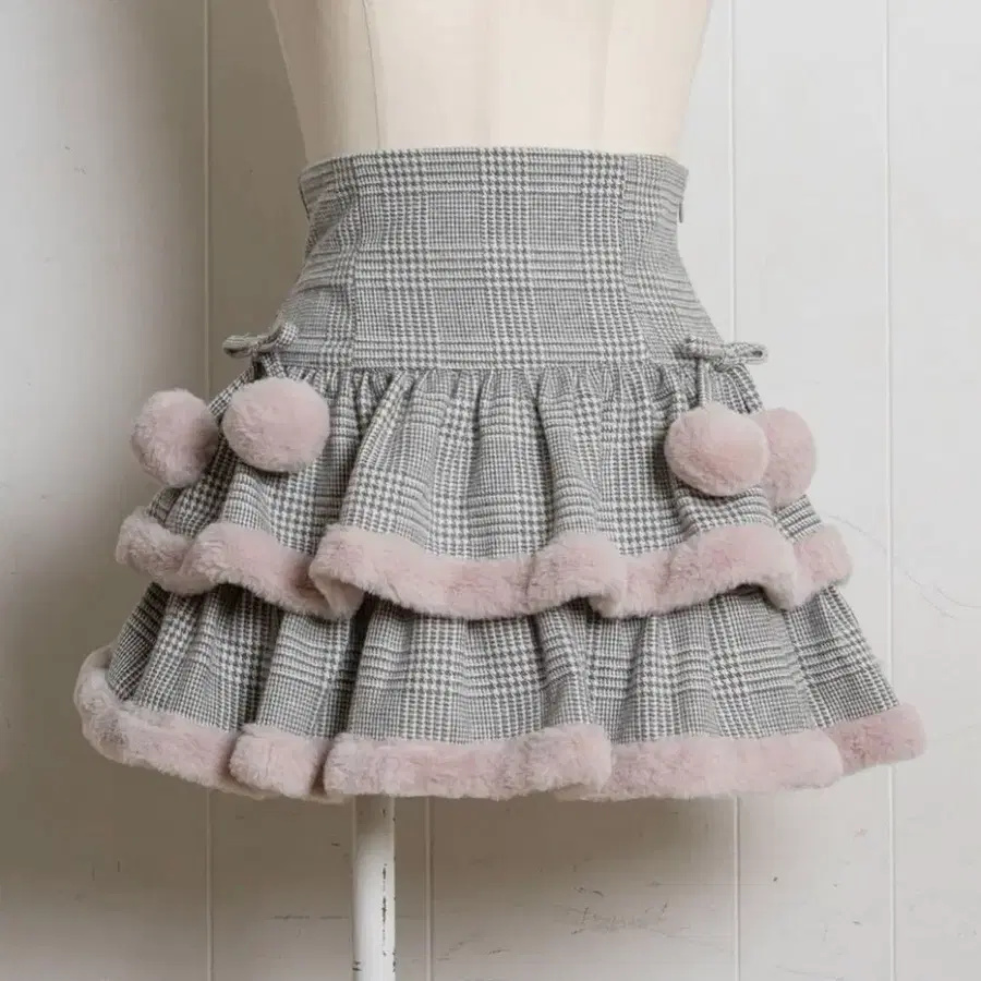 pium 피움 ぴうむ 티어드 퍼 포함 체리 미니 스커트 스커트 그레이 그레이 체크 폼폼 핑크
