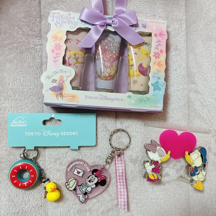 *핸드크림 - 1개 남았습니다. 한 번만 테스트 사용했습니다. [ ※ 배송비를 절약하기 위해 개봉하여 소분해서 보내드립니다 ] *칩만 키링 *미니 키링 *도날드와 데이지 사진 스탠드 클립 (메모 스탠드?) - 가격표는 제거했지만 미사용입니다. 잘 부탁드립니다!