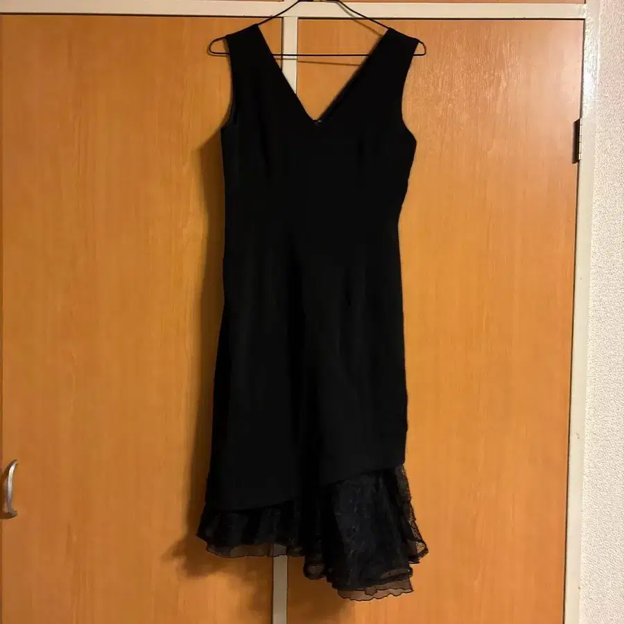 V넥과 레이스 밑단이 특징인 타이트핏 슬리브리스 원피스. - 색상: 블랙 - 디자인: V넥, 슬리브리스, 레이스 밑단 - 스타일: 타이트핏, 무릎 기장 방문해 주셔서 감사합니다.