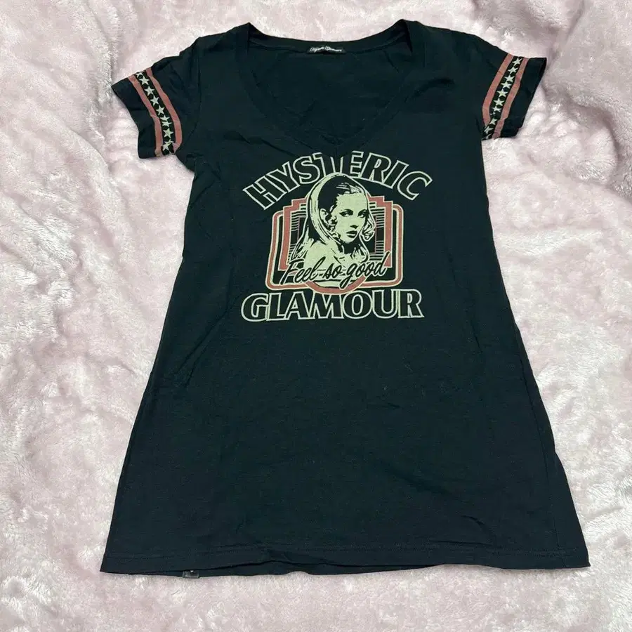 HYSTERIC GLAMOUR의 V넥 티셔츠, 별 패턴 스트라이프가 특징.