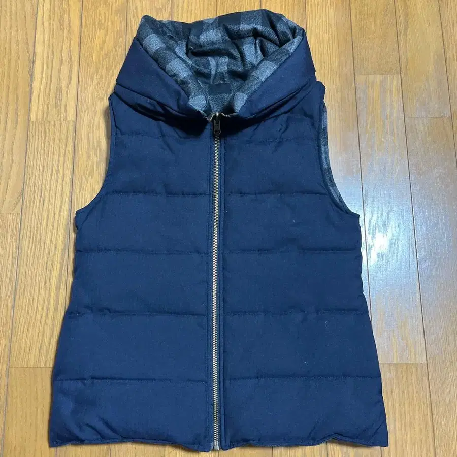 후드 부착 네이비 다운 베스트, 지퍼 개폐, 체크 무늬 안감.