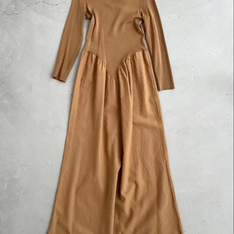 베이지 색상의 레이온 나일론 혼방 소재 롱 원피스입니다. 심플하고 세련된 디자인입니다.