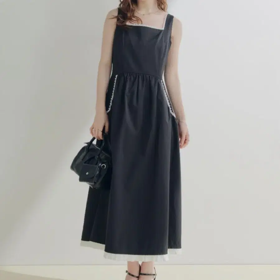 ECREL 림 레이스 프릴 개더 원피스 슬리브리스 원피스 블랙