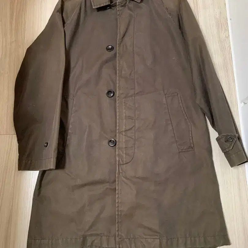 코튼 소재의 브라운 버튼 코트, 스탠드 카라와 사이드 포켓이 있습니다.