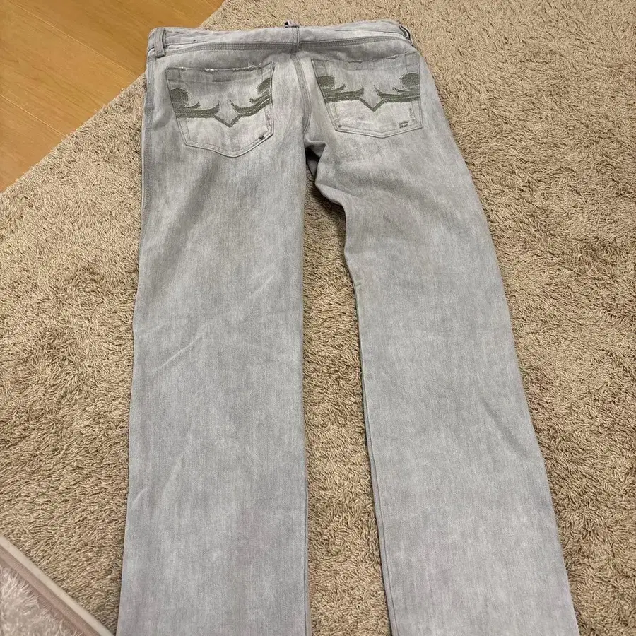 라이트 그레이 슬림핏 데님, 자수 포켓 부착. - 색상: 라이트 그레이 - 디자인: 자수 포켓 - 스타일: 슬림핏 방문해 주셔서 감사합니다. 원하시면 사이즈를 재어 드리겠습니다. 대략 S 사이즈입니다.