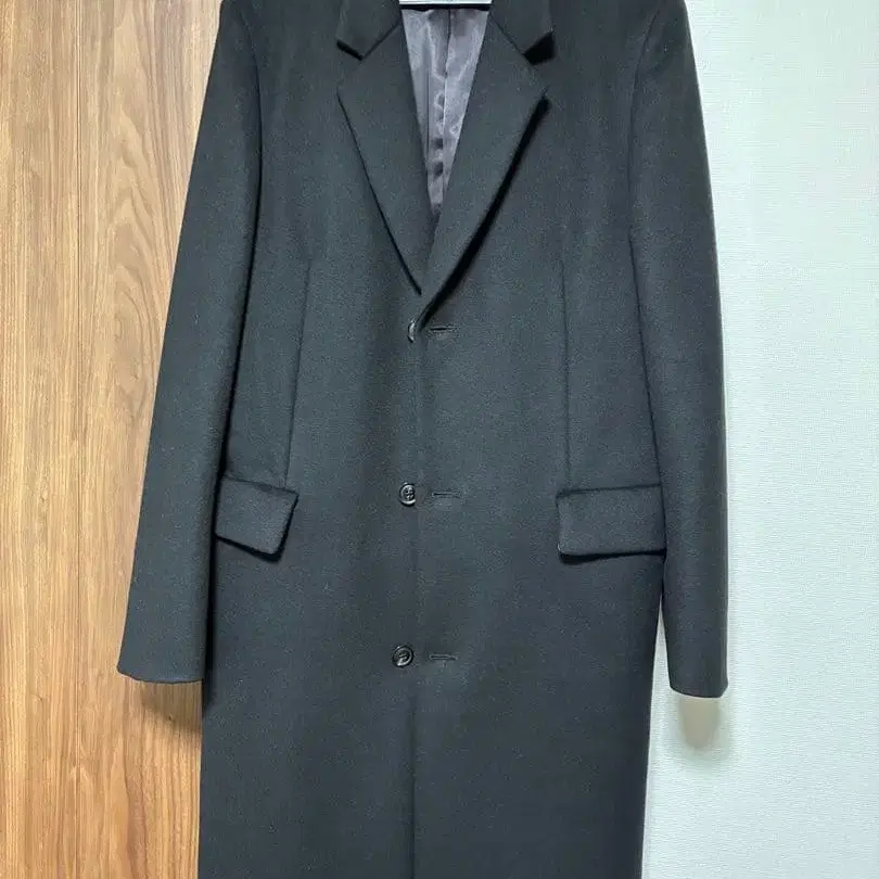 심플하고 스타일리시한 블랙 체스터 코트, 빨간색 안감과 그린색 포켓이 특징입니다.