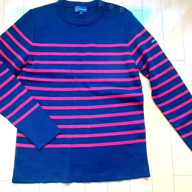 네이비와 레드 스트라이프 디자인, 버튼이 달린 긴팔 상의. - 브랜드: Armor Lux - 색상: 네이비/레드 - 디자인: 스트라이프 - 사이즈: 3 - 특징: 버튼 포함 방문해 주셔서 감사합니다.