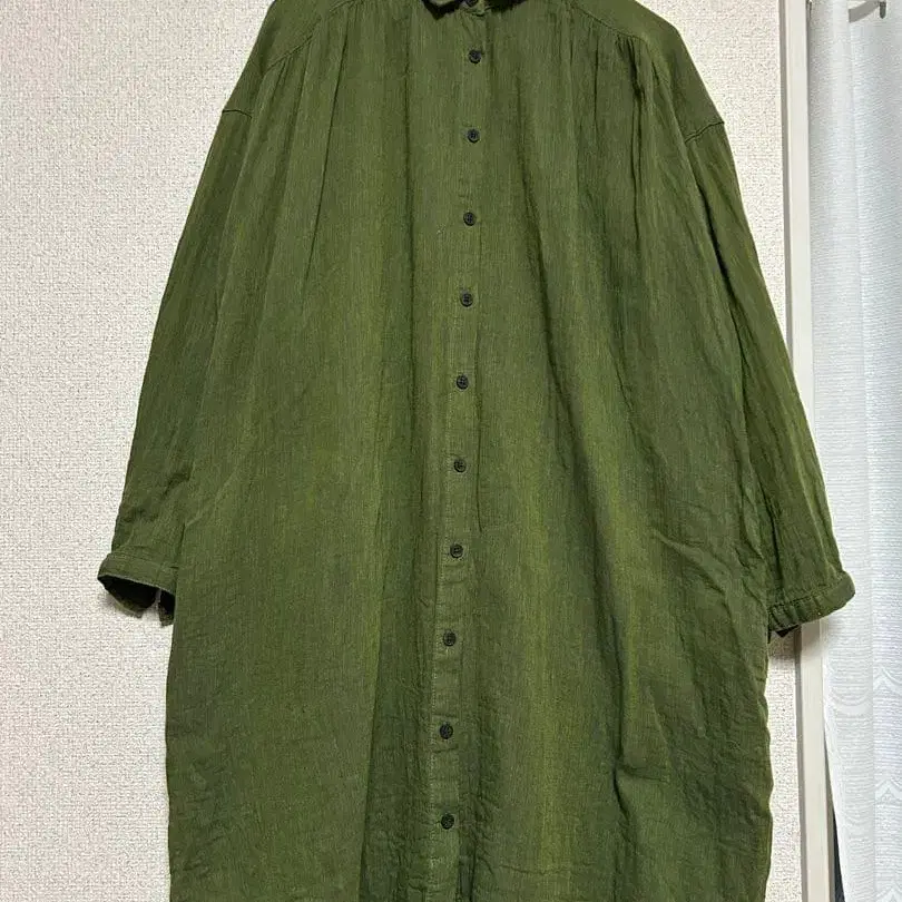 올리브 그린 긴팔 셔츠 원피스, 스탠드 카라와 버튼 프론트 오픈 디자인.