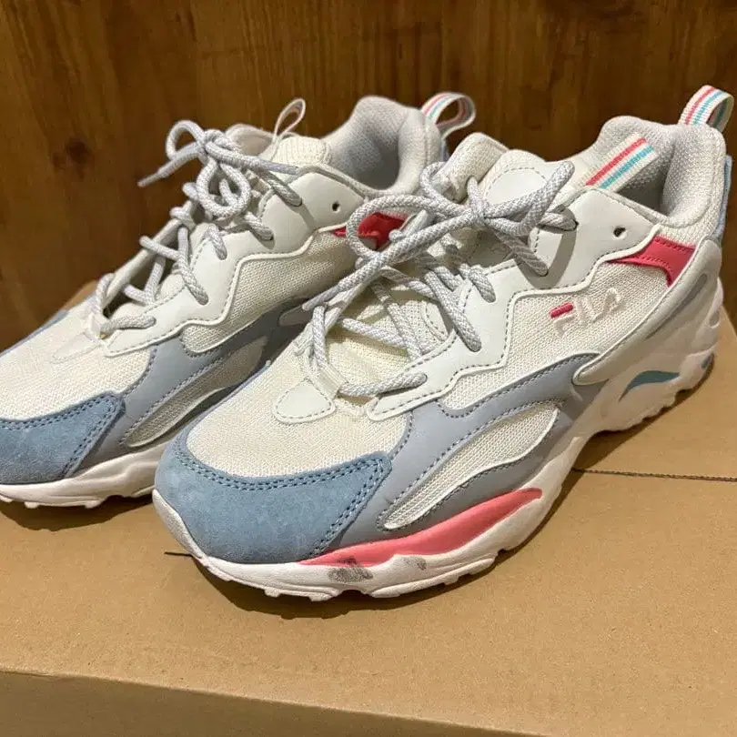 아내가 구매 후 1주간 정도 신었으나 발에 맞지 않아 판매하게 되었습니다. 잘 부탁드립니다. - 브랜드: FILA - 색상: 화이트/그레이/핑크 - 스타일: 스니커즈 방문해 주셔서 감사합니다.