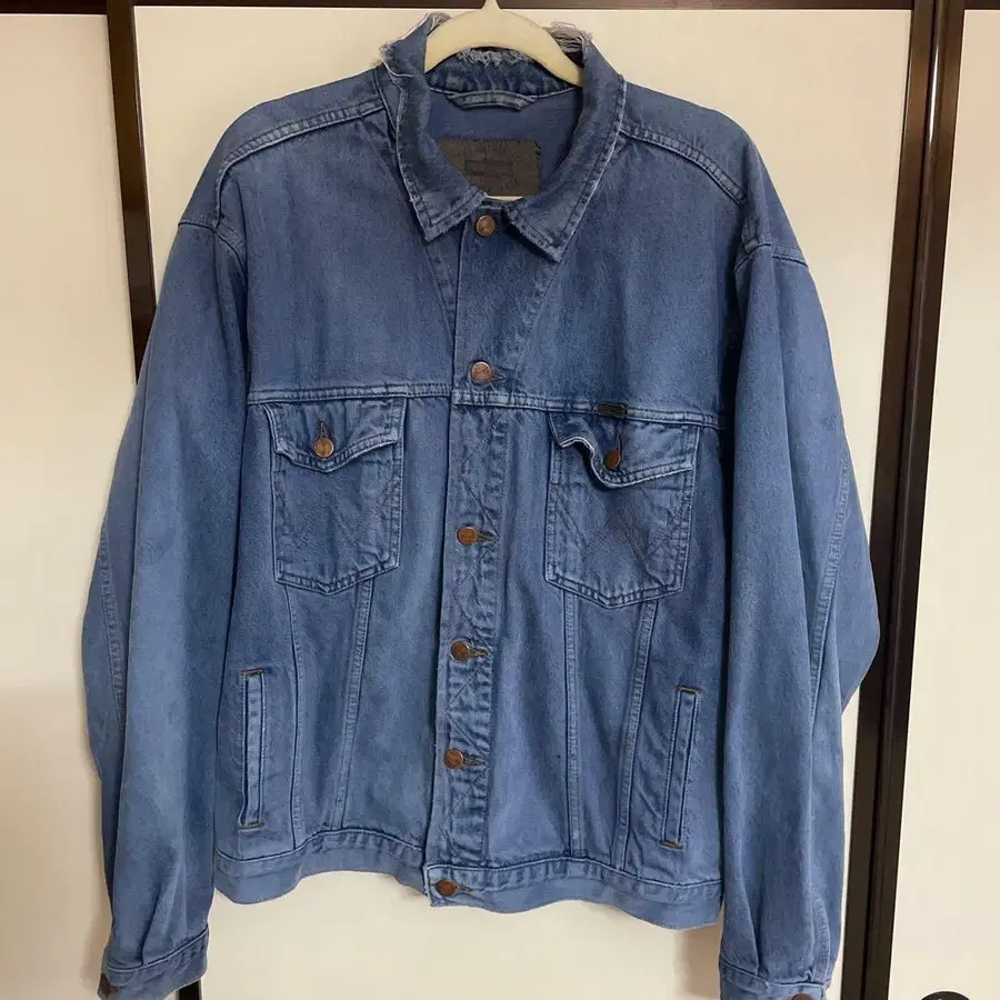 오버 사이즈 라이트 블루 데님 자켓, 앞면에 2개의 포켓 부착.