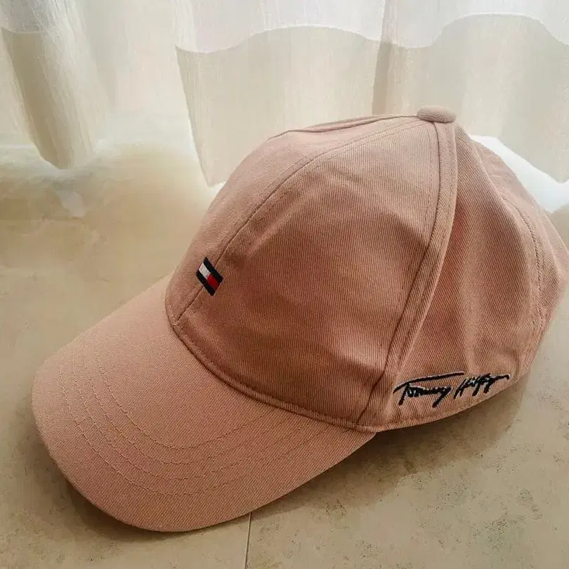 타미힐피거 로고 자수가 들어간 핑크색 캡, 조정 가능한 스트랩 포함.