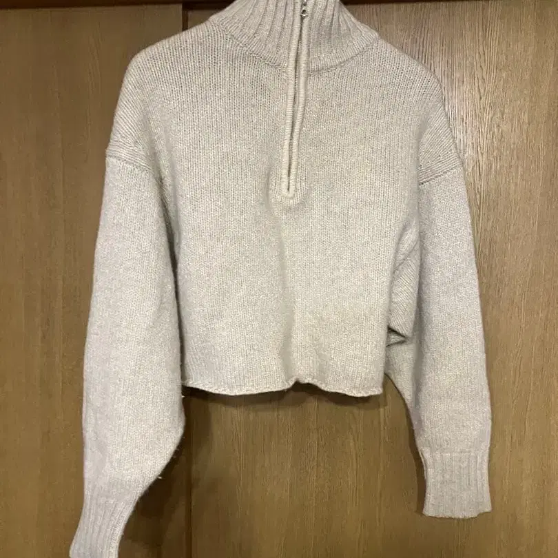 울 79%와 나일론 21% 소재로, 하이넥과 지퍼 디자인이 특징인 크롭 기장의 스웨터입니다.