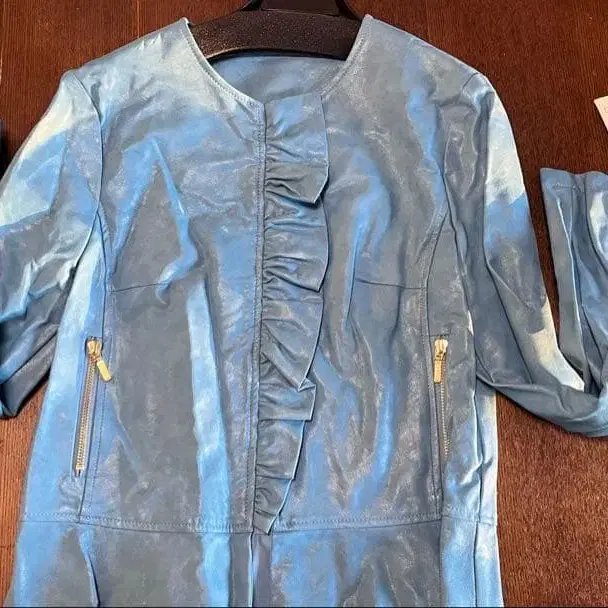 프릴 디자인의 라이트 블루 자켓, 사이드 지퍼와 실크 느낌의 안감이 특징입니다.