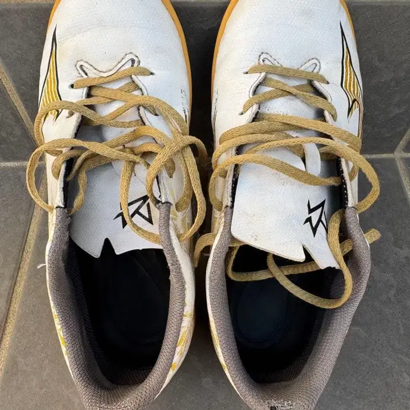 Mizuno의 화이트와 골드 색상의 꽃무늬 풋살화. - 브랜드: Mizuno - 색상: 화이트/골드 - 밑창 소재: 고무 - 디자인: 꽃무늬 방문해 주셔서 감사합니다. 사이즈 - 22cm