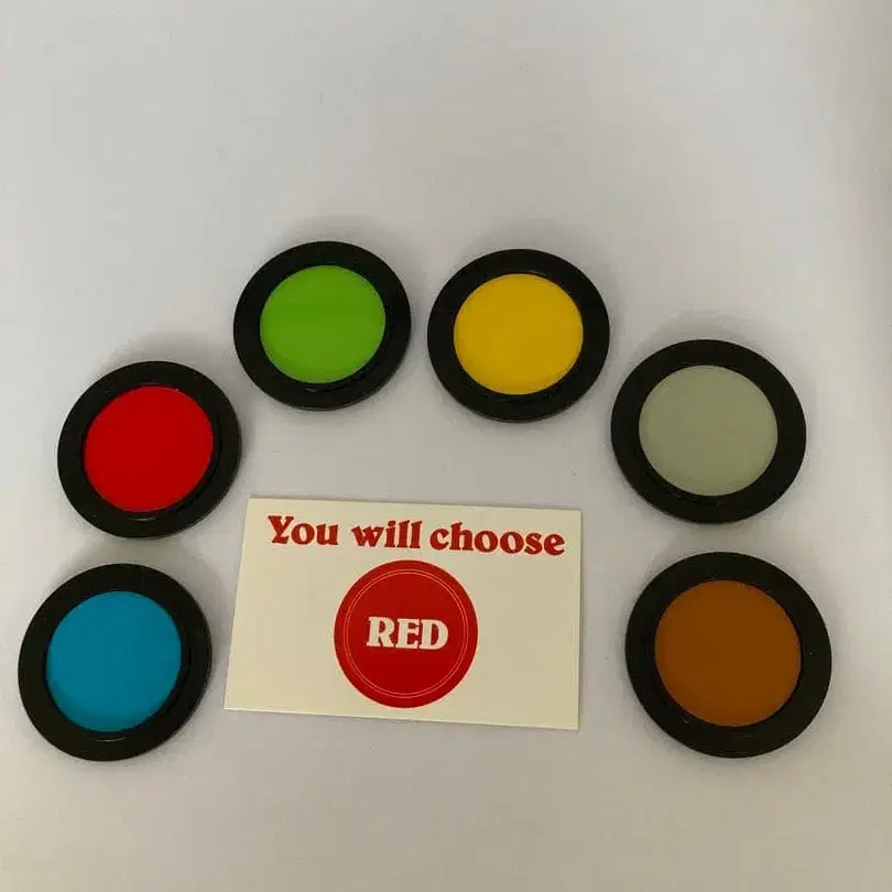 예언을 넣은 봉투와 색이 다른 6개의 칩이 있습니다. 칩을 뒤집어서 섞습니다. 상대방은 그 중에서 1개의 칩을 자유롭게 선택합니다. 그때 상대방에게 봉투를 열게 하여, 예언 카드에 쓰여진 색을 말하게 합니다. 선택된 칩을 뒤집으면, 그것은 놀랍게도 맞습니다.