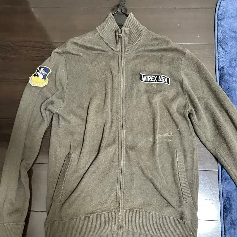 올리브 그린 색상의 집업 점퍼, TWENTIETH AIR FORCE 패치가 부착되어 있습니다.