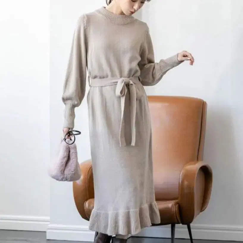 MercuryDuo 백리본 레이디 롱 니트 원피스 베이지