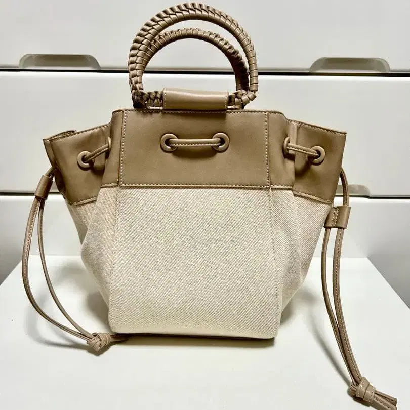 캔버스와 합성 피혁 소재의 베이지 복조리형 숄더백, 뜨개질 핸들 포함. - 색상: 베이지 - 소재: 캔버스와 합성 피혁 - 내부 포켓: 있음 (지퍼와 오픈 포켓) - 핸들: 뜨개질 디자인 - 스타일: 복조리형 - 높이: 26cm - 너비: 35cm (복조리를 펼쳤을 때) - 바닥: 세로 14cm, 가로 18cm 자택 보관이므로 이해해 주시는 분께 구매 부탁드립니다. 방문해 주셔서 감사합니다.