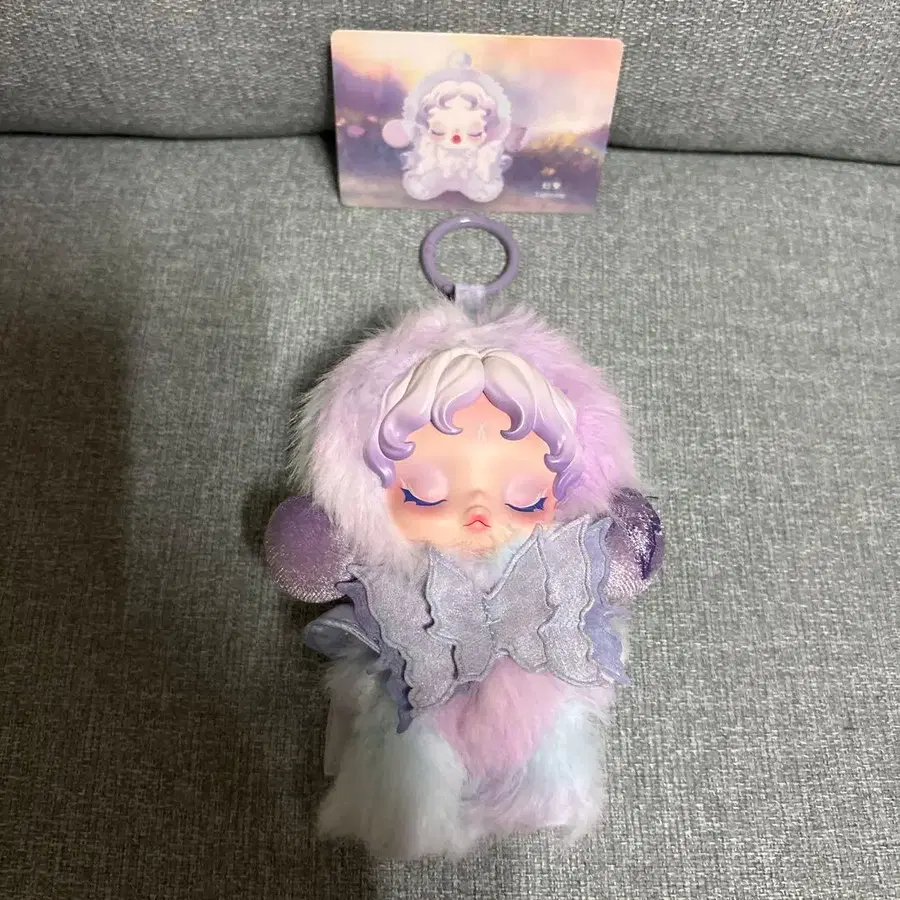 자동 번역되었어요. 원문보기퍼플 퍼 소재로, 눈을 감은 귀여운 디자인의 봉제 인형.