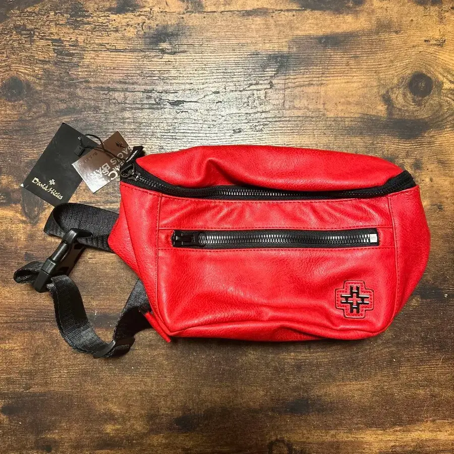 레드 색상의 합성 피혁 소재 바디백, 조정 가능한 스트랩 포함.