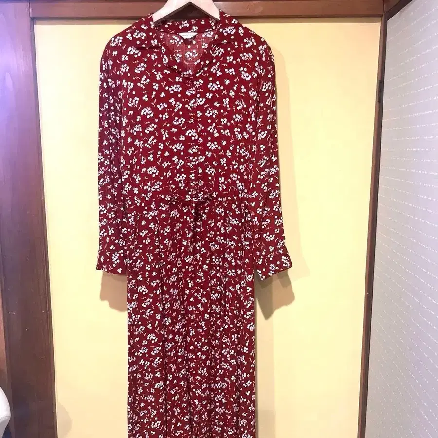 빨간색과 화이트 꽃무늬가 특징인 긴팔 롱 원피스