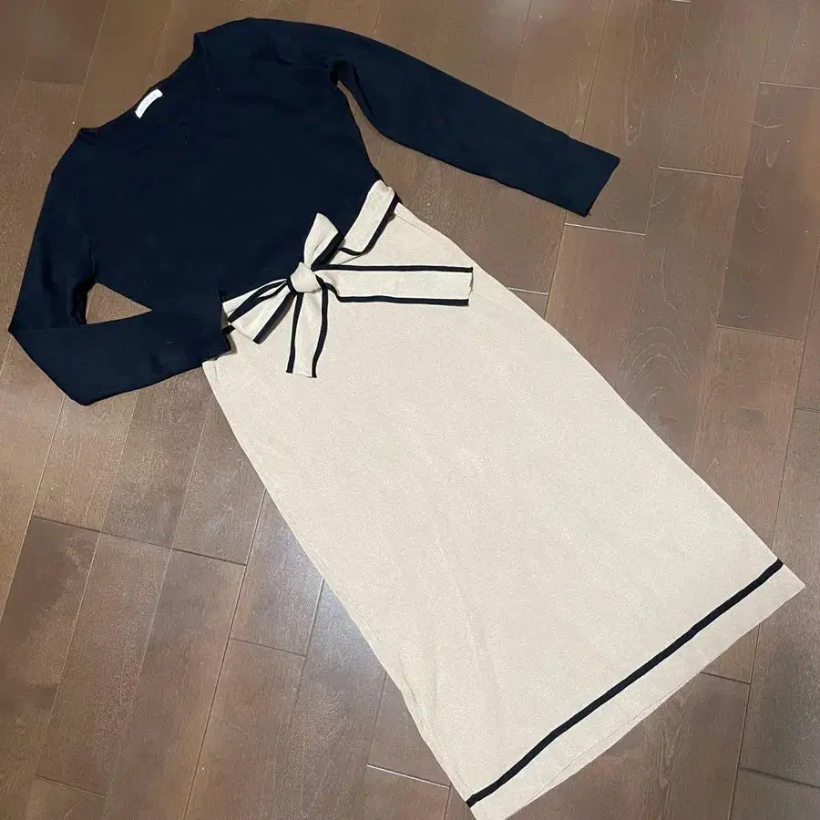 블랙과 베이지 리본 포함 니트 원피스, 긴팔, 타이트 핏 디자인. - 색상: 블랙과 베이지 (색상은 4, 5번째 이미지를 참조해 주세요.) - 디자인: 리본 포함 허리 디자인 - 소매 길이: 긴팔 - 소재: 니트 - 스타일: 타이트 핏 방문해 주셔서 감사합니다. 평평하게 놓았을 때 사이즈 ✳︎ 기장 107cm ✳︎ 가슴둘레 41cm ✳︎ 복부둘레 36cm