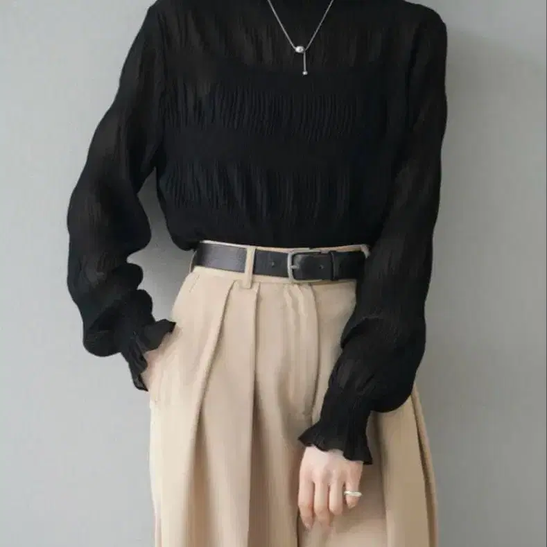 fitmore 슬릿 슬리브 밑단 프릴 티어드 블라우스 그레이