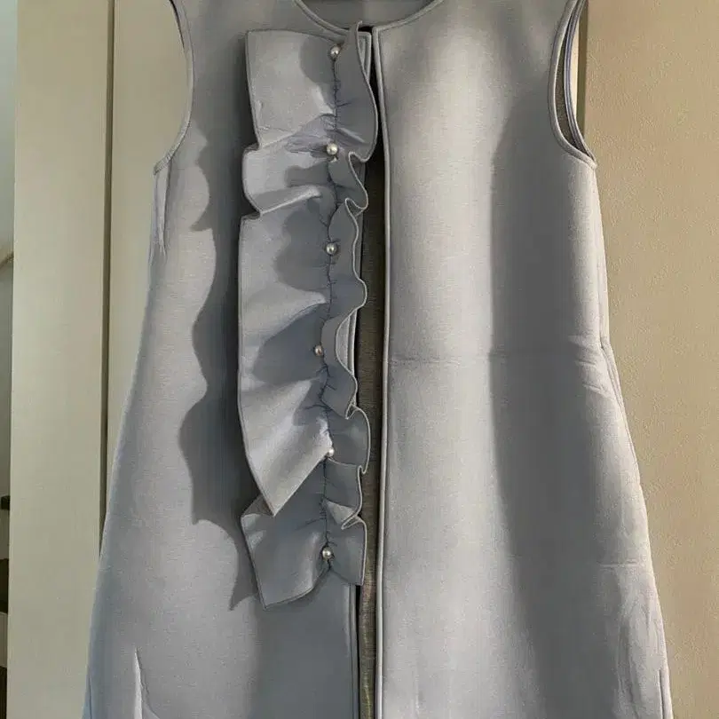 프릴과 펄 버튼이 특징인 라이트 블루 색상의 슬리브리스 무릎 기장 베스트