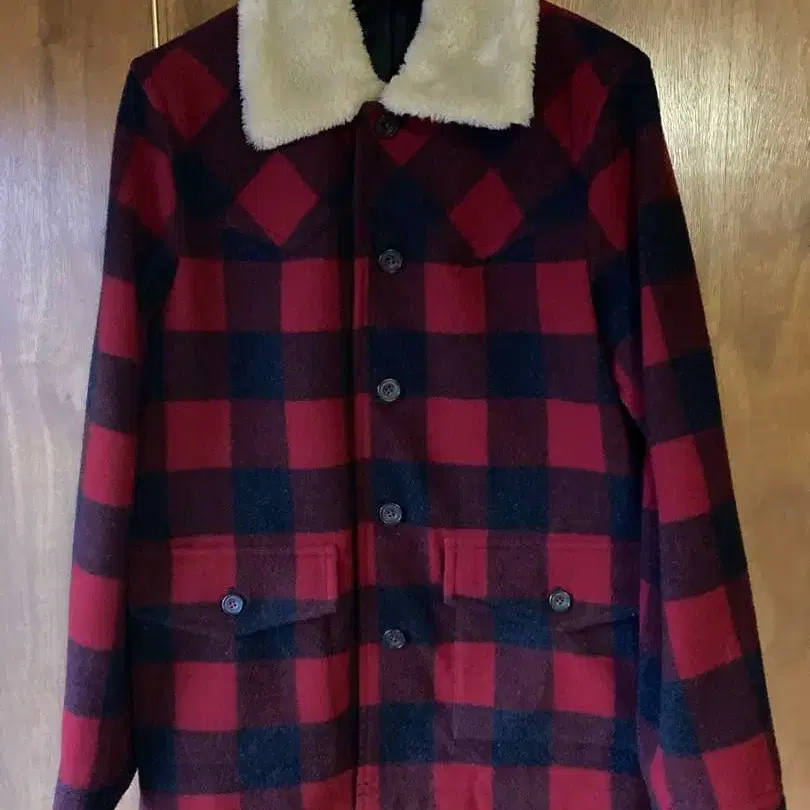 울 혼방의 빨간색과 블랙 체크 무늬 자켓, 보아 옷깃 부착으로 따뜻함을 제공합니다. - 색상: 빨간색과 블랙 체크 무늬 - 소재: 울 혼방 - 옷깃: 보아 옷깃 - 포켓: 앞면에 2개의 포켓 - 디자인: 뒷면에 다트 부착 - 버튼: 앞면에 단추식 방문해 주셔서 감사합니다.