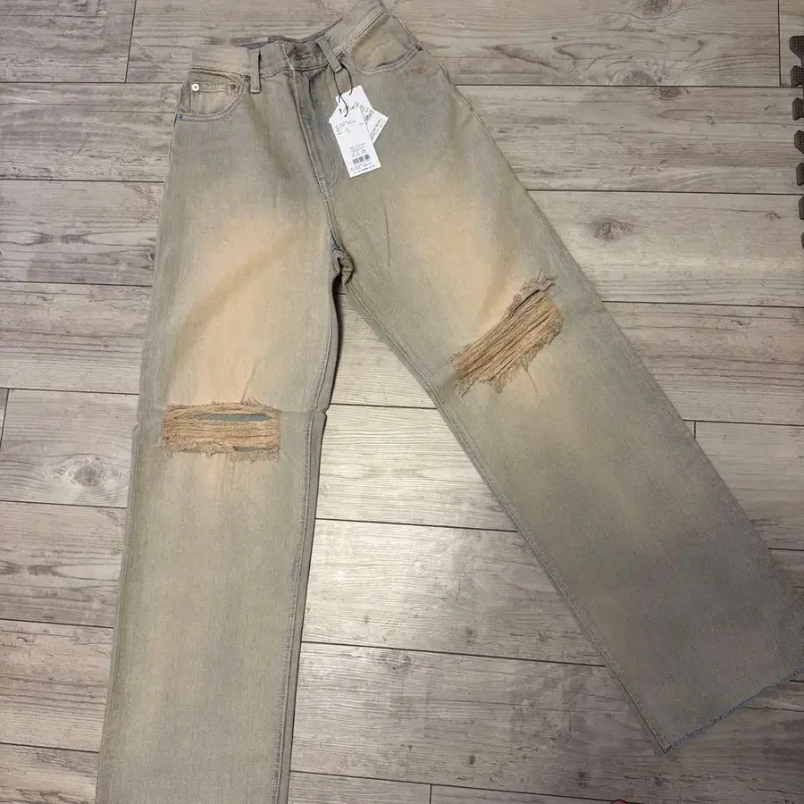 라이트 블루 데미지 가공 데님, 스트레이트 핏.
