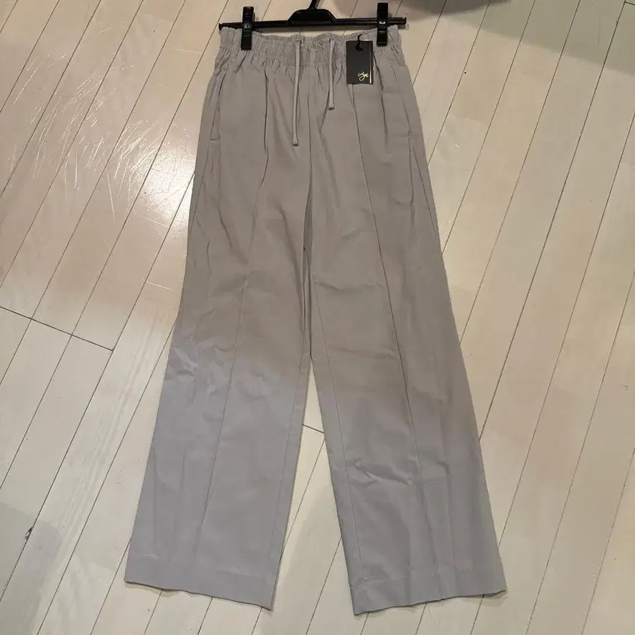 허리밴딩과 드로우 스트링이 있는 심플한 그레이 와이드 팬츠.