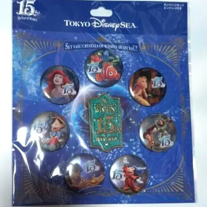 디즈니씨 15주년 캔뱃지 세트 중앙에 핀 배지가 달려 있습니다.