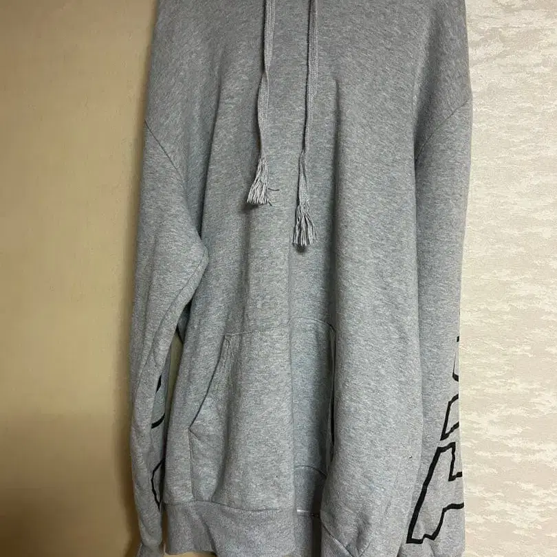 자동 번역되었어요. 원문보기후드 부착 그레이 후드티, 앞 포켓과 큰 로고가 특징.