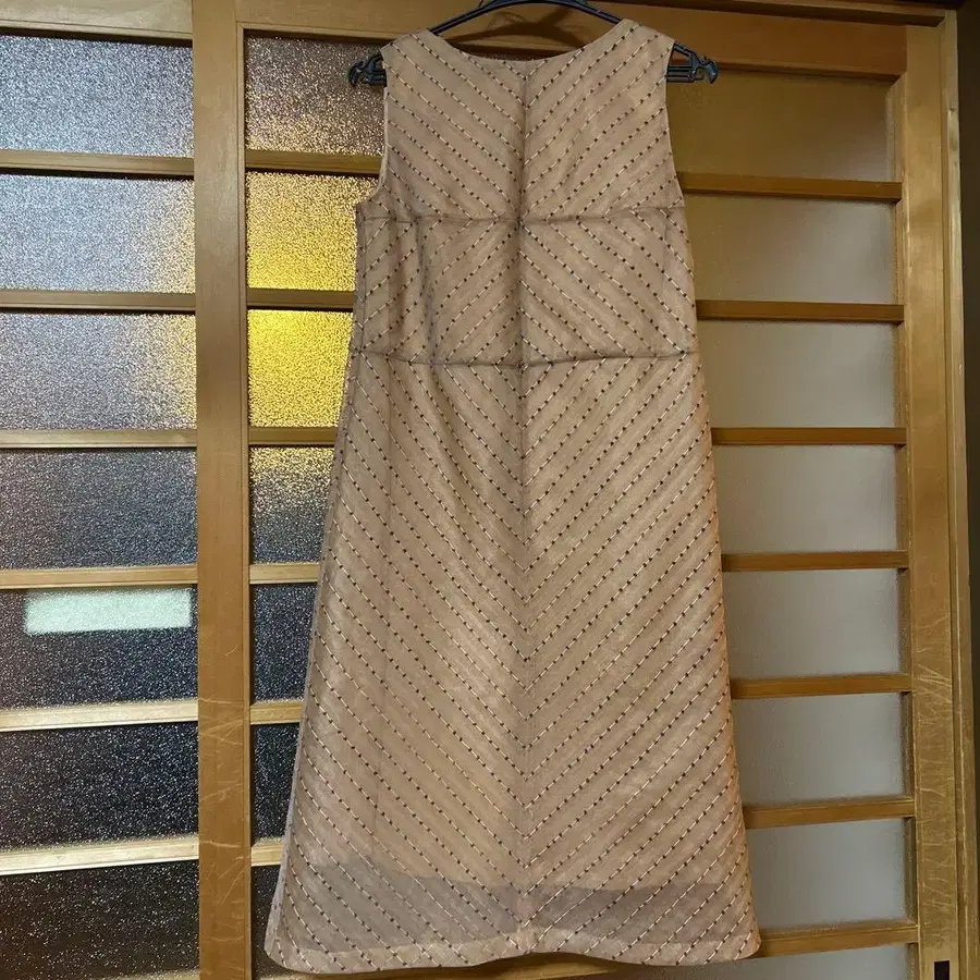 베이지 색상의 슬리브리스 원피스, 비즈 자수로 엘레강트한 디자인. - 색상: 살몬 핑크 - 디자인: 슬리브리스 - 장식: 비즈 자수 방문해 주셔서 감사합니다.