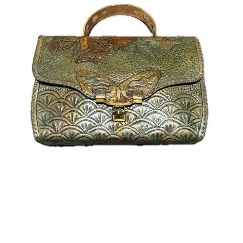나비와 꽃 엠보싱 가공이 된 가죽 핸드백. - 디자인: 나비와 꽃 엠보싱 가공 - 소재: 가죽 - 클로징: 금속제 락 - 컬러: 그린과 골드 콤비네이션 레트로한 분위기의 카빙 백입니다. 천연 가죽에 꽃무늬와 나비 디자인이 더해져 섬세한 디테일이 매력적입니다. 앤티크풍 금장 장식이 포인트가 되어줍니다. [ 소재 ] 천연 가죽 [ 디자인 ] 꽃무늬, 나비 [ 개폐 ] 금장식 [ 상품 상태 ] 전반적으로 사용감이 있으며, 금장 부분에 약간의 탁함이 보입니다. 또한, 가죽 표면에 작은 마찰과 색바램이 일부 있지만, 큰 데미지 없이 계속 사용 가능합니다. 사진으로 판단해 주세요. USED 가정 보관에 대한 이해 부탁드립니다. 잘 부탁드립니다. 방문해 주셔서 감사합니다.