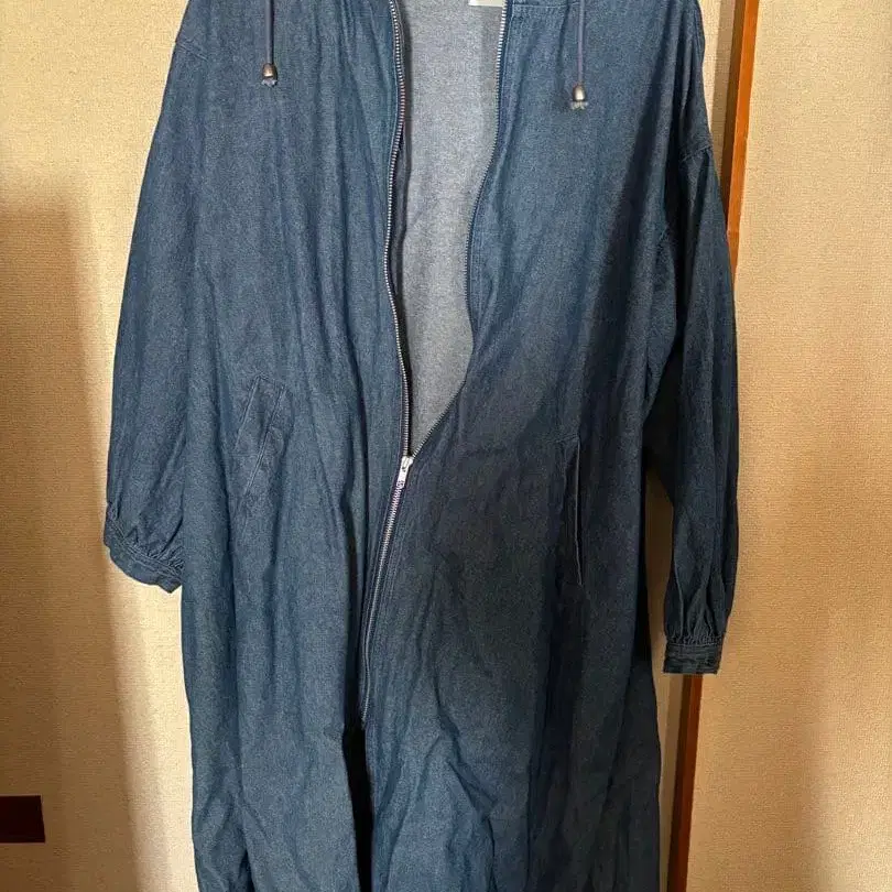 자동 번역되었어요. 원문보기데님 블루 후드 부착 자켓, 사이드 포켓과 프론트 지퍼 부착.