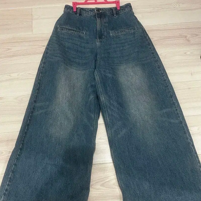 다크 블루 와이드 레그 데님, 앞뒤 포켓 부착. 허리 33 총장 110 신장 170 착용 시 밑단이 멋스럽게 떨어집니다! 약간 쓸려서 4번째 사진과 같은 상처가 있습니다.