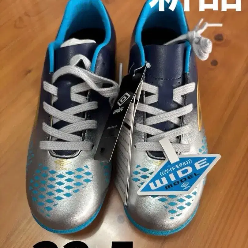 실버와 네이비 색상의 풋살화, 와이드 사이즈로 쾌적한 핏감. - 브랜드: Umbro - 색상: 실버/네이비/블루 - 밑창 디자인: 트레드 패턴 적용 - 사이즈: 와이드 - 스타일: 풋살화 - 사이즈: 22.5cm 방문해 주셔서 감사합니다. 종류 - 트레이닝 슈즈