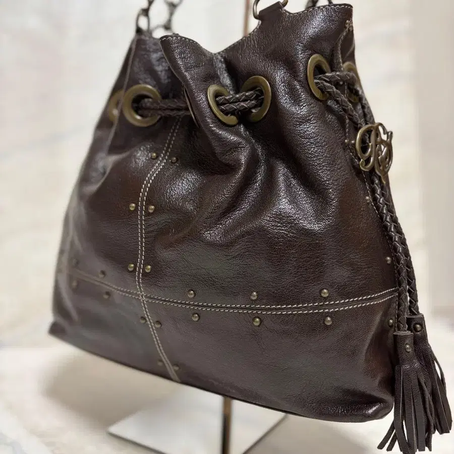 [ 컨디션 최상 ✨ ] 폴 스튜어트 스터드 뜨개질 태슬 체인 금장 장식 가죽 토트백 다크 브라운