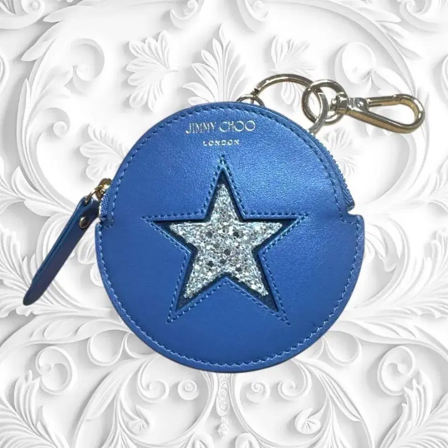 파란색 원형 코인 케이스, 별 모양 장식 포함.