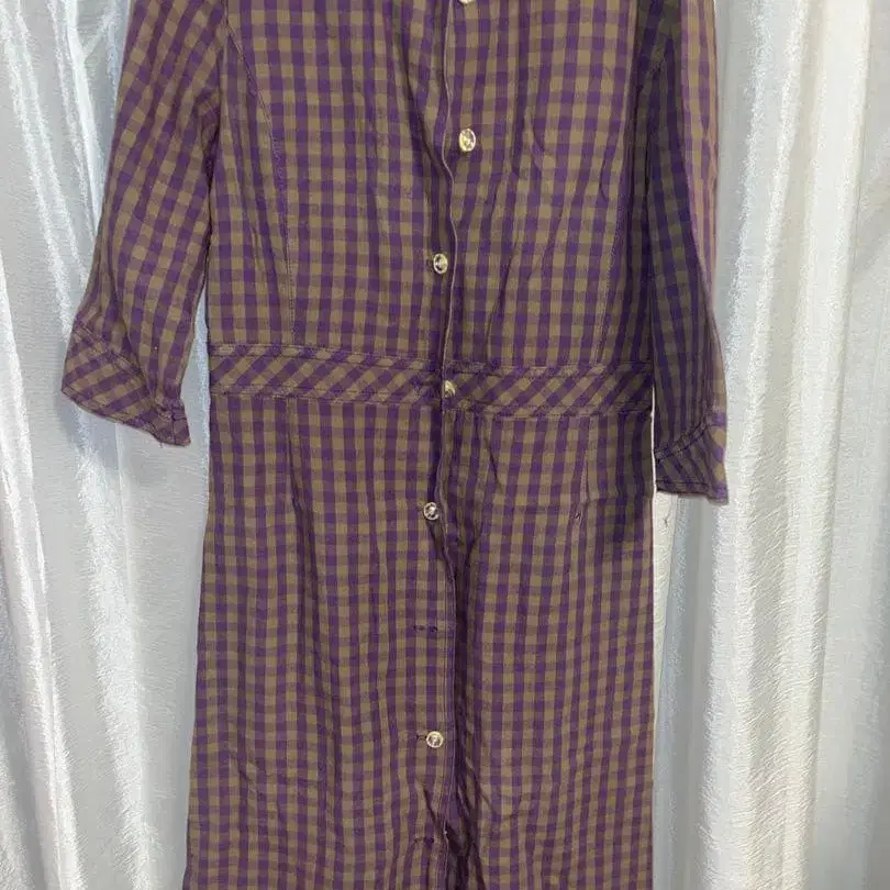 보라색과 노란색 체크 무늬의 버튼이 달린 셔츠 원피스, 긴팔 디자인.