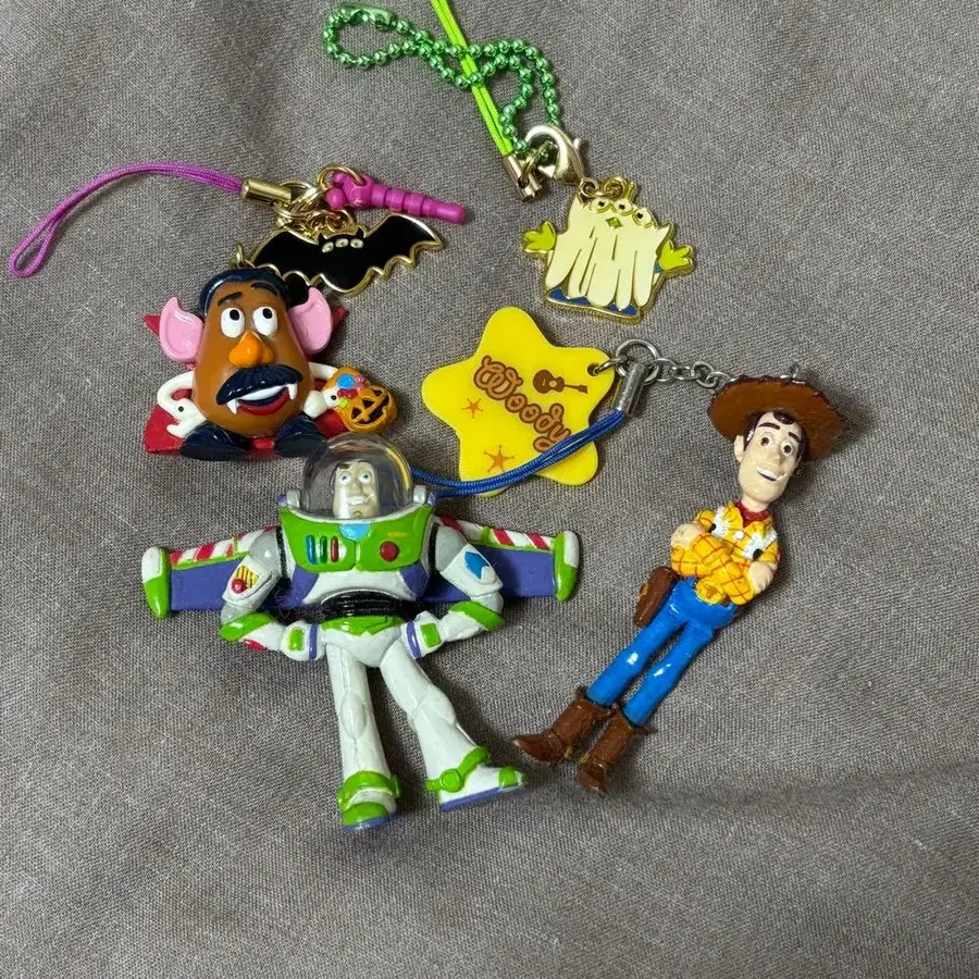 토이스토리 캐릭터 4개 세트입니다. 버즈만 스트랩이 떨어져 있습니다. 디즈니를 좋아하시는 분들께 추천합니다. 버즈 라이트이어 우디 포테이토 헤드 에이리언